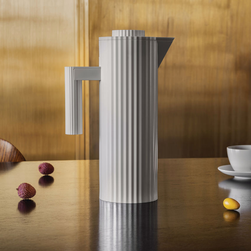 The "PLISSÉ" thermal jug is lightweight, easy to use, and practical. It consists of a lid, which has a button to open and close, an internal container with double-walled thermal glass, and a button on top of the handle that allows the jug to be opened so that the internal container can be removed.