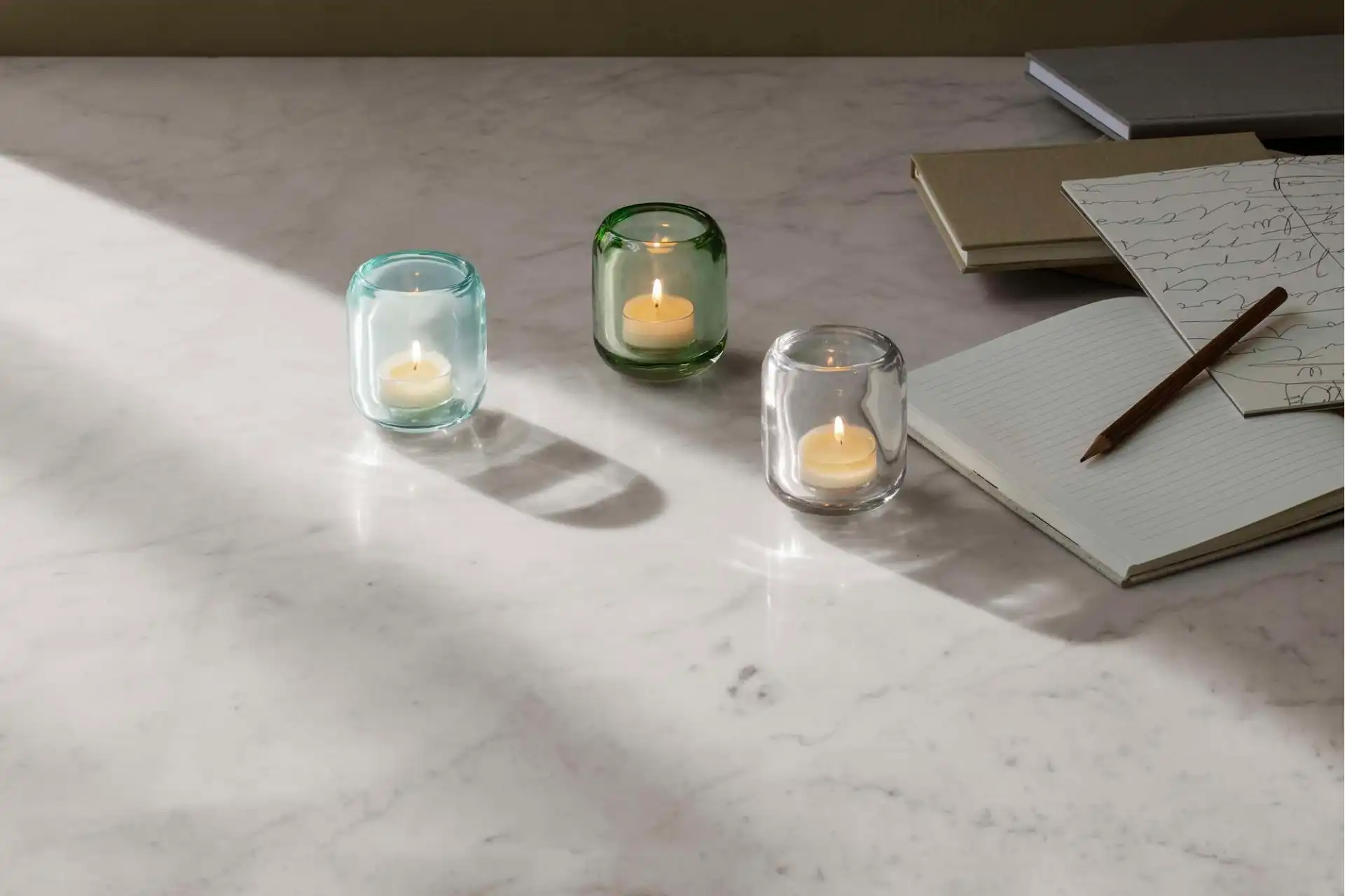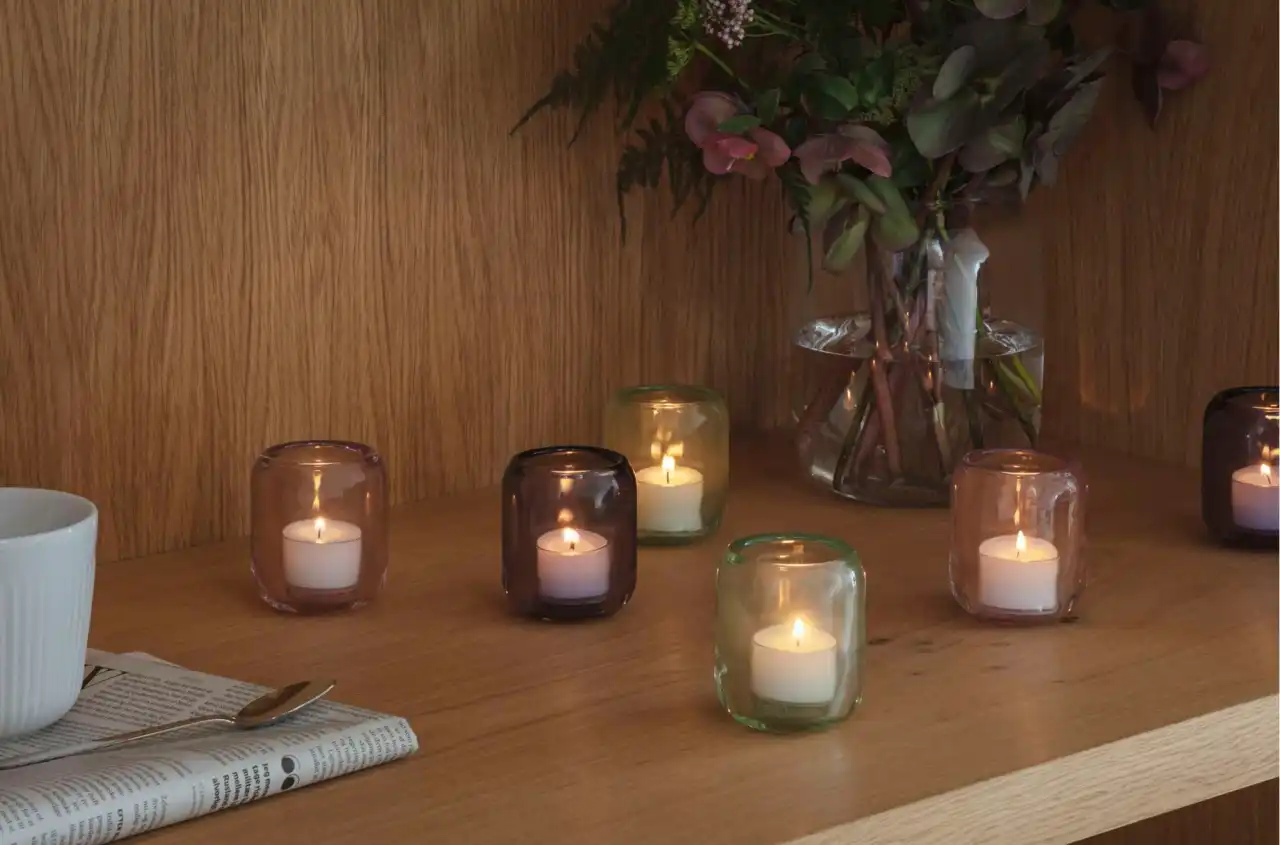 Create an ambience of candle-lit ‘hygge’ with these elegant tea light holders in coloured glass. Use the tea light holders individually or in pairs and enjoy the beauty of the flames reflected in the glass. The tea light holders are robust, designed for everyday use and dishwasher-safe.
