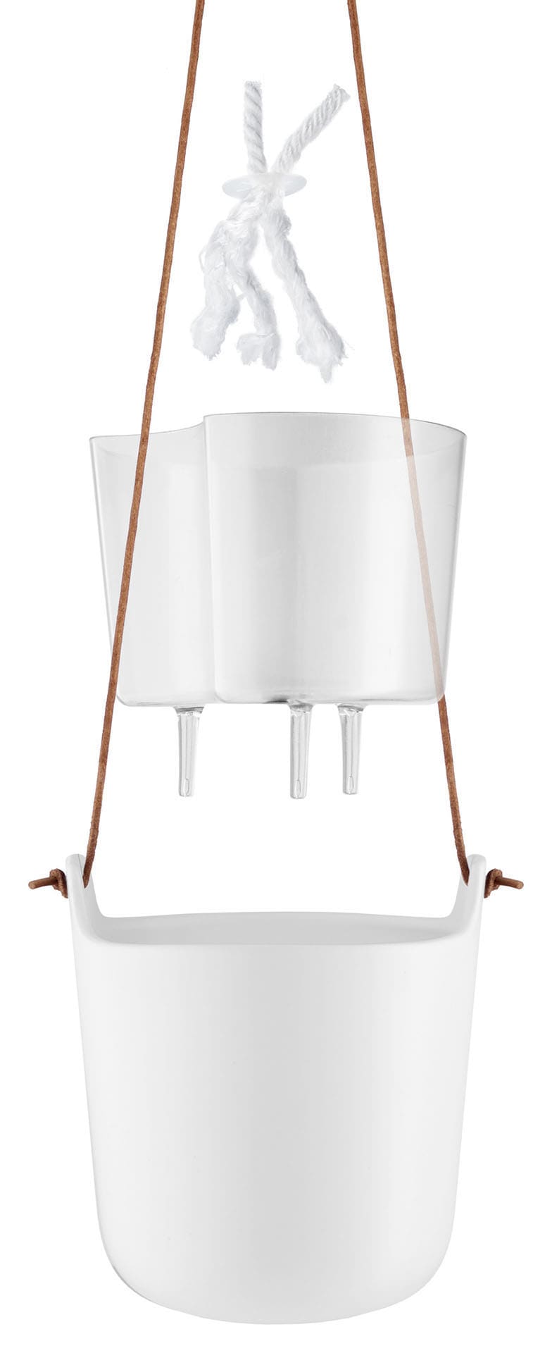 The "SELF-WATERING" hanging pot has an organic design and a self-watering system that offers optimal growing conditions for plants. Nylon wicks, present at the bottom of the vase, allow the plant to extract the necessary amount of water. This has an irrigation channel, which facilitates its replenishment.