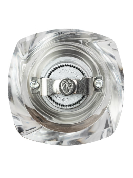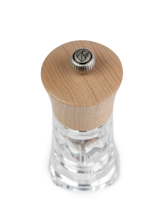The transparent acrylic body, with a subtle spiral shape, allows for a clear view of the contents, while the natural beech wood top adds an authentic and sophisticated finish. Inside, the high-performance mechanism includes a pre-cutting system that makes it easier to grind dried chili peppers, releasing their full aroma and intensity.