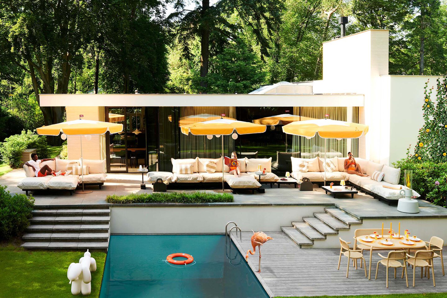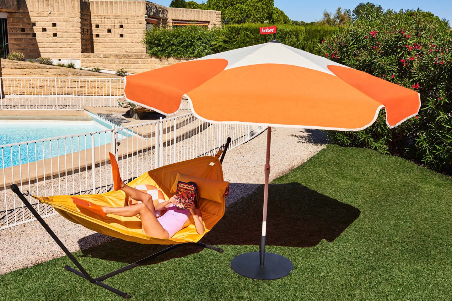 Abra o Sunshady e sinta a verdadeira sensação de férias! Com um padrão que faz referência ao estilo retro, este guarda-sol transporta-o para a beira da piscina de um hotel elegante. Esta sensação é ainda mais acentuada pelas clássicas abas com acabamento em branco.